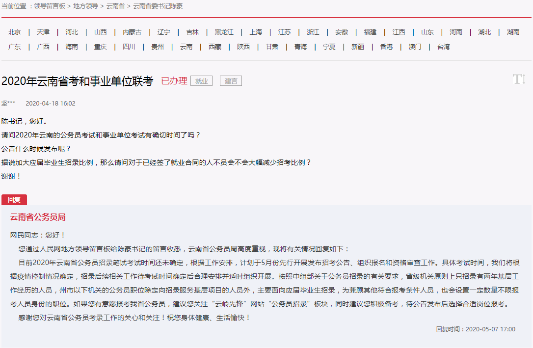 受疫情影響,2020年各類考試都推遲進(jìn)行,在就業(yè)嚴(yán)峻的情況下,眾多考生非常關(guān)注2020云南省考何時(shí)開始。近日,在“人民網(wǎng)領(lǐng)導(dǎo)留言板”欄目中云南省公務(wù)員局就何時(shí)開展2020省考進(jìn)行了答復(fù),具體內(nèi)容如下: