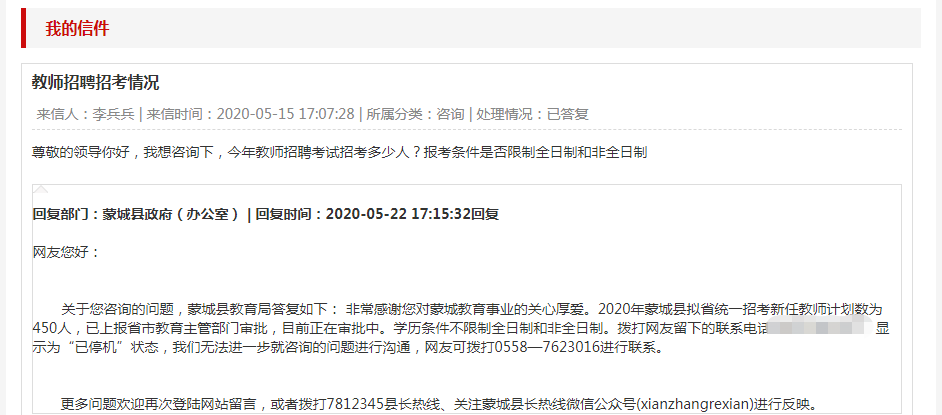 更多問題歡迎再次登陸網(wǎng)站留言,或者撥打7812345縣長熱線、關注蒙城縣長熱線微信公眾號(xianzhangrexian)進行反映。