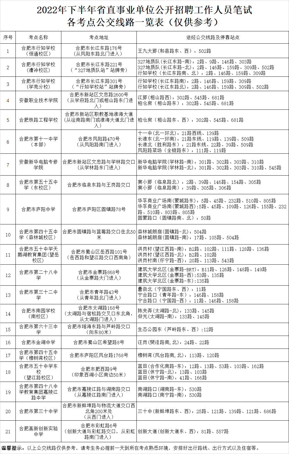 2022年下半年省直事業(yè)單位公開招聘工作人員筆試各考點(diǎn)公交線路一覽表(僅供參考)
