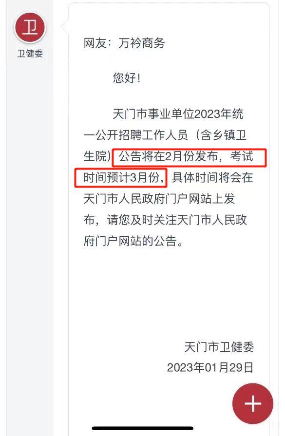 天門衛(wèi)健委回復(fù):天門市事業(yè)單位2023年統(tǒng)一公開招聘工作人員(含鄉(xiāng)鎮(zhèn)衛(wèi)生院)公告將在2月份發(fā)布,考試時間預(yù)計(jì)3月份……