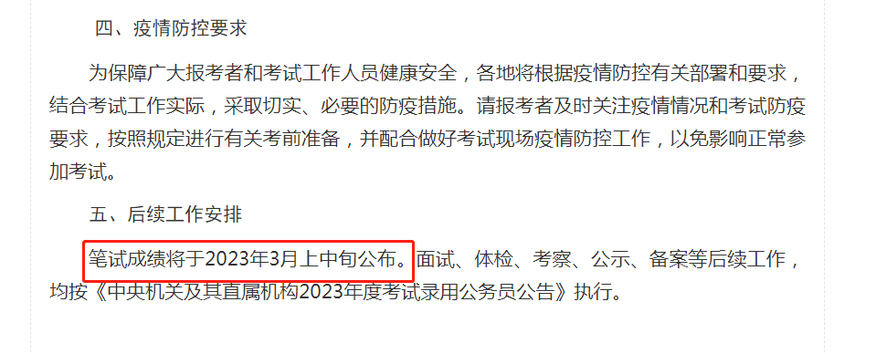 2022年12月16日,國家公務(wù)員局發(fā)布了《關(guān)于中央機(jī)關(guān)及其直屬機(jī)構(gòu)2023年度考試錄用公務(wù)員筆試時(shí)間安排及有關(guān)事項(xiàng)的公告》,其中有提到關(guān)于國考成績發(fā)布的時(shí)間:筆試成績將于2023年3月上中旬公布。