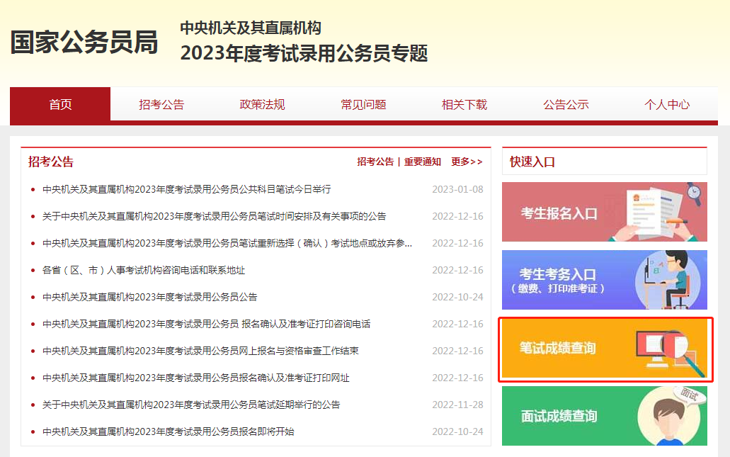 國考成績發(fā)布后,考生通過中央機(jī)關(guān)及其直屬機(jī)構(gòu)2023年度考試錄用公務(wù)員專題網(wǎng)站,進(jìn)入“筆試成績查詢”網(wǎng)頁即可查成績,進(jìn)面名單可能會(huì)在查成績的同一天發(fā)布,也有可能會(huì)延遲一兩天發(fā)布。