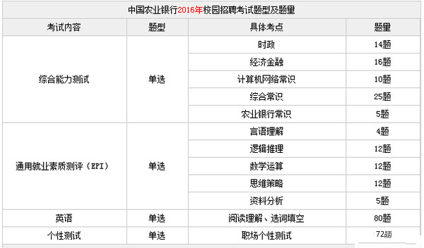 2018中國(guó)農(nóng)業(yè)銀行校園招聘考試內(nèi)容根據(jù)歷年考情來(lái)看,中國(guó)農(nóng)業(yè)銀行校招考試內(nèi)容基本變化不大,包括:通用素質(zhì)能力測(cè)試(EPI)、綜合能力測(cè)試、英語(yǔ)、性格測(cè)試。主要是在具體考試項(xiàng)目、題量上有相應(yīng)變化。(以下往年考試科目及題量?jī)H供參考,具體以2018農(nóng)行校園招聘考試為準(zhǔn)。)