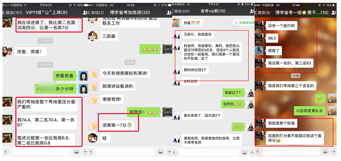 在2010年—2018年國(guó)考中,很多人僅僅是因?yàn)榭戳司W(wǎng)上博學(xué)教育公務(wù)員班的幾段視頻,就毫不猶豫地選擇博學(xué)教育,最終成功地實(shí)現(xiàn)了他們的公務(wù)員之夢(mèng)。2010年安徽省考高陽(yáng)同學(xué)面試取得88.4的高分,一舉從筆試第23名躍居為綜合排名第一名,成為巢湖市面試狀元;胡卓然同學(xué)以86分的成績(jī)勇奪南京市第一名,被南京市國(guó)土資源局錄取。廣東的鄭滋潤(rùn)同學(xué),數(shù)次公考面試失敗,2011年慕名來(lái)到博學(xué)施老師門下,經(jīng)過(guò)七天學(xué)習(xí),脫胎換骨,以91分的成績(jī)遙遙領(lǐng)先對(duì)手被財(cái)政部駐深圳市專員辦錄取!2011年安徽省考季毓同學(xué)面試取得88的高分,成為馬鞍市面試狀元;2012年上海的潘安安同學(xué),以88.3的高分被上海海關(guān)隸屬海關(guān)通關(guān)業(yè)務(wù)部門錄取。2013年福建的王子熙同學(xué),以89.4的高分被廈門海關(guān)廈門地區(qū)隸屬海關(guān)或辦事處錄取。2013年安徽省考牛園園同學(xué)取得面試86.8分,成為亳州市面試狀元!2014年安徽的曹珍同學(xué),以86.8的成績(jī)勇奪安徽省直面試狀元,被安徽省女子監(jiān)獄錄取。2015年國(guó)考安徽的曹燦同學(xué),以92.25分的成績(jī)被中國(guó)銀行業(yè)監(jiān)督管理委員會(huì)安徽監(jiān)管局錄??!2015年安徽省考陳雯同學(xué)以面試87.2的高分勇奪蕪湖市面試狀元;趙錦同學(xué)以面試86.4的高分取得天長(zhǎng)市面試狀元;查菁文同學(xué)以面試86的高分取得定遠(yuǎn)縣面試狀元。2016年國(guó)考面試,張雨豪以91分的成績(jī)被甘肅省國(guó)家稅務(wù)局錄取。2016年安徽省考陳蓉同學(xué)以面試86.8分取得馬鞍山市非鄉(xiāng)鎮(zhèn)公務(wù)員面試狀元;2017年國(guó)考,劉大偉勇奪山東省面試狀元,以98.67分被商務(wù)部錄??;阮帆同學(xué)面試取得91.33分,上海市國(guó)稅錄??;鄭想同學(xué)面試取得90.3分,上海國(guó)稅錄;2017年安徽省考顧博賢同學(xué)以面試88分取得利辛縣非鄉(xiāng)鎮(zhèn)公務(wù)員面試狀元。2018年國(guó)考徐起以87.33分被中央國(guó)家機(jī)關(guān)工委錄取,夏鈺以88.33分被中國(guó)浦東干部學(xué)院錄取。2018年安徽省考,周陽(yáng)以83.8分取得銅陵市鄉(xiāng)鎮(zhèn)層級(jí)面試狀元;魏宇以82.8分取得亳州市鄉(xiāng)鎮(zhèn)層級(jí)面試狀元!