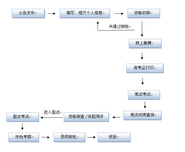 考試錄用工作按照制定錄用計(jì)劃、發(fā)布招考公告、報(bào)名與資格審查、筆試、資格復(fù)審、體能測(cè)評(píng)(人民警察職位)、面試、體檢與考察、公示、審批錄用等步驟進(jìn)行,由省公務(wù)員主管部門統(tǒng)一組織,有關(guān)工作由各市、省直管縣公務(wù)員主管部門和省直招錄機(jī)關(guān)具體組織實(shí)施。